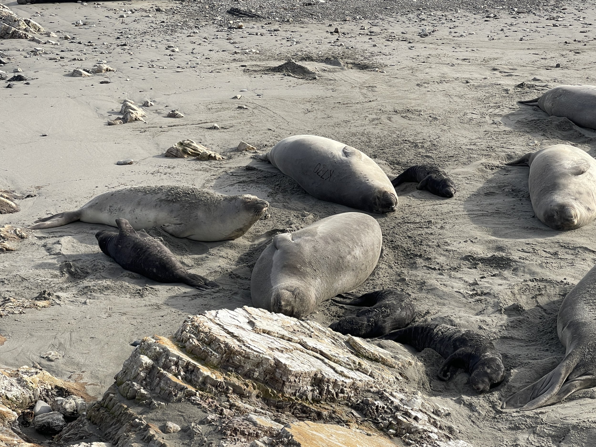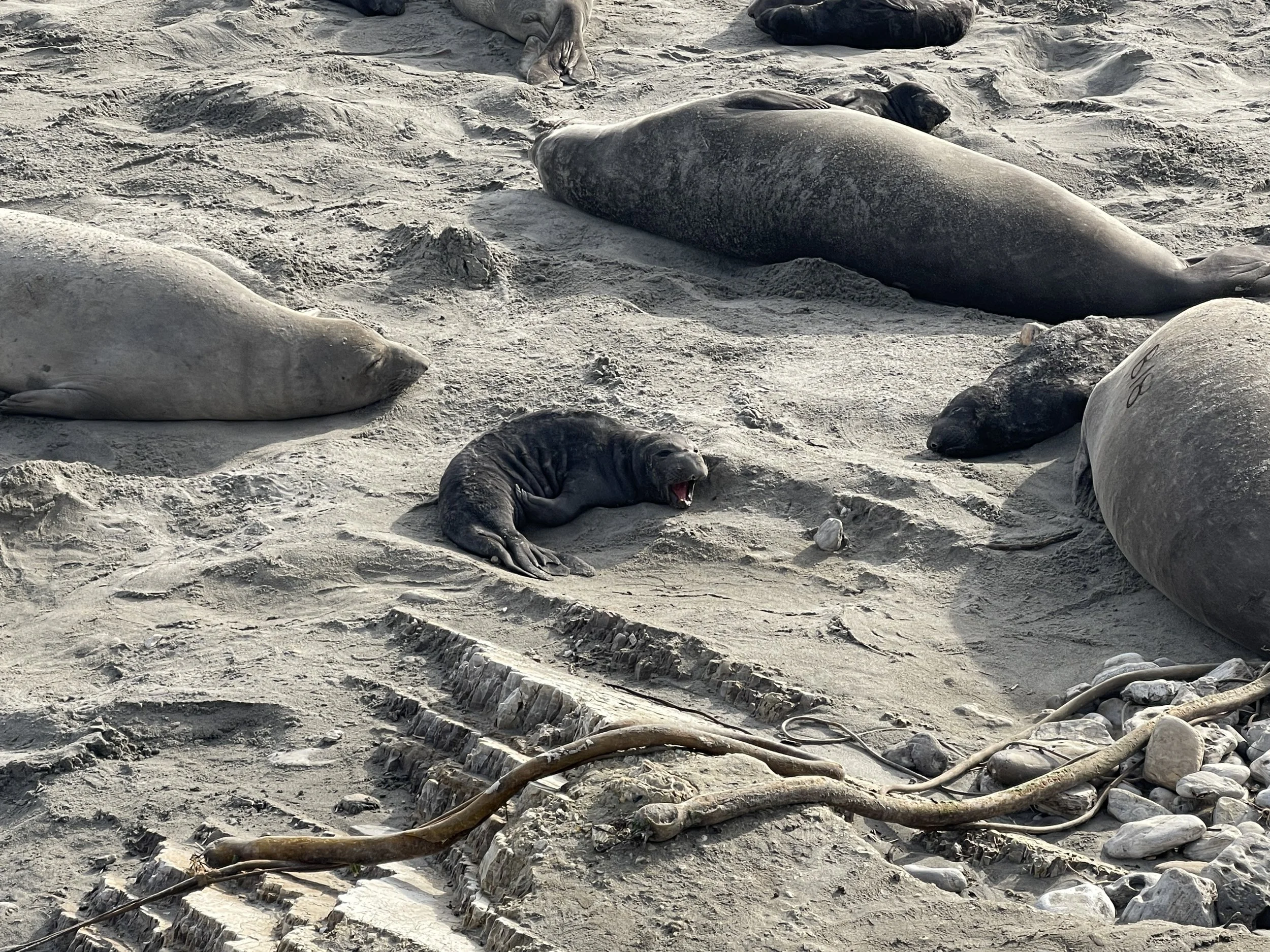 The little black baby seals are scattered along the beach next to their mothers who are nursing them. There is one pup per mom. The seals come up on shore for months during this time and don’t drink or eat. They just live off the blubber. I was wondering why it didn’t smell there and the docent told us that since they don’t eat, they are also not pooping during this time.
